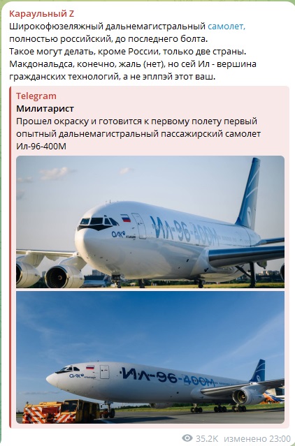 Широкофюзеляжный дальнемагистральный самолёт, полностью российский, до последнего болта. Такое могут делать, кроме России, только две страны. Макдоналдса, конечно, жаль (нет), но сей Ил - вершина гражданских технологий, а не эплпэй этот ваш,