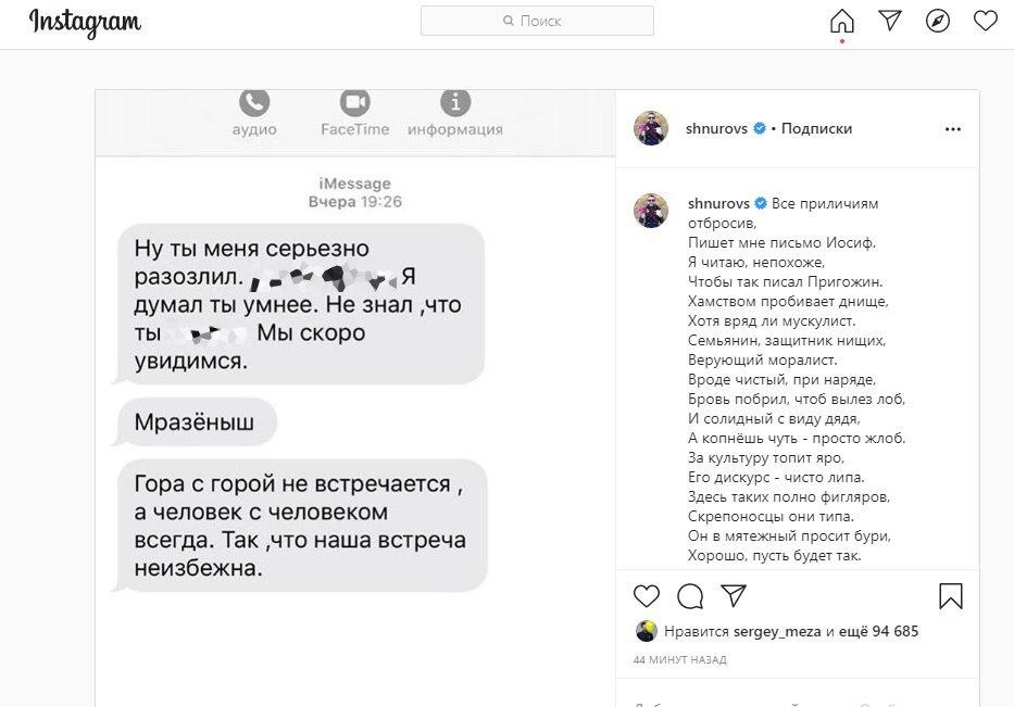 Вероятно, на мужской разговор питерский рокер прийти отказался, а вместо этого выложил в своём инстаграме скриншот переписки якобы с Пригожиным. Хотя никаких доказательств того, что автором сообщений является муж Валерии, не представил.