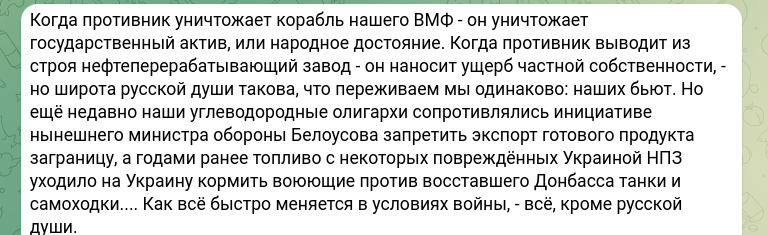 Когда противник уничтожает корабль нашего ВМФ - он уничтожает государственный актив, или народное достояние. Когда противник выводит из строя нефтеперерабатывающий завод - он наносит ущерб частной собственности, но широта русской души такова, что переживаем мы одинаково: наших бьют,