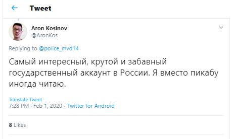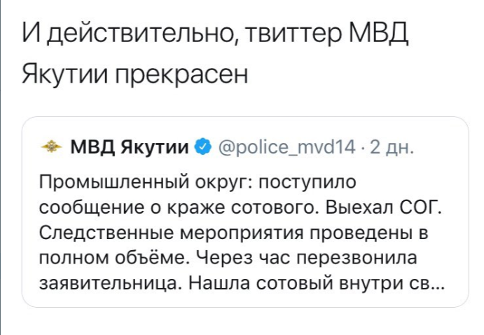 Сегодня у "Твиттера" якутского МВД почти 3000 фолловеров, и эта цифра постоянно растёт, что неудивительно: каждому хочется с утра читать не про коронавирус и "Брекзит", а например, такое: