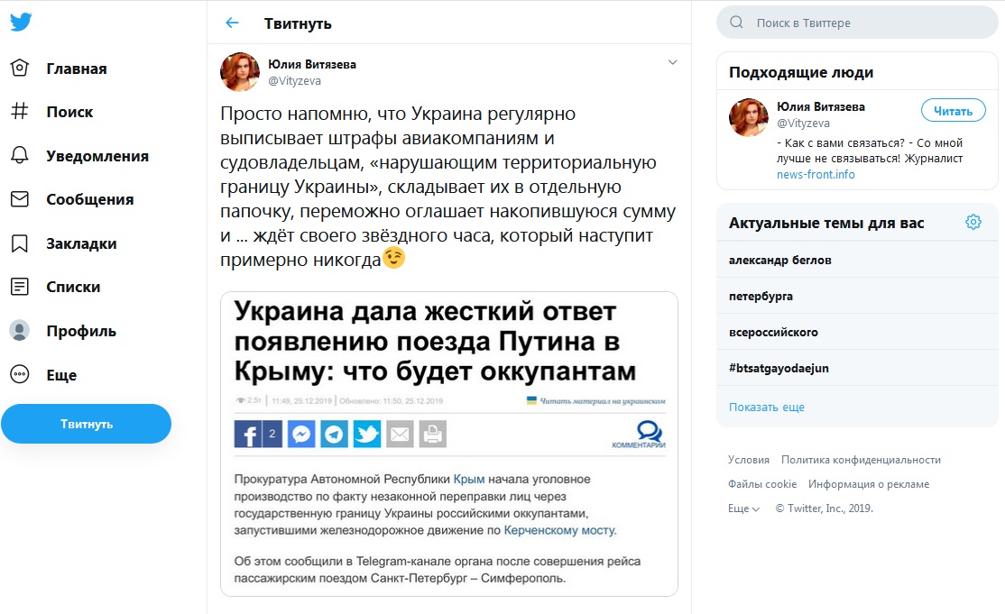 "Просто напомню, что Украина регулярно выписывает штрафы авиакомпаниям и судовладельцам, "нарушающим территориальную границу Украины", складывает их в отдельную папочку, переможно оглашает накопившуюся сумму и... ждёт своего звёздного часа, который наступит примерно никогда", - пишет Юлия Витязева в Twitter.