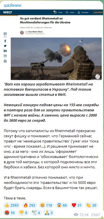 Он также добавил, что, по его мнению, "в Rheinmetall отлично понимают, что при необходимости это "правительство" и по 5 000 евро будет брать снаряды", если на то будет отмашка из Вашингтона.