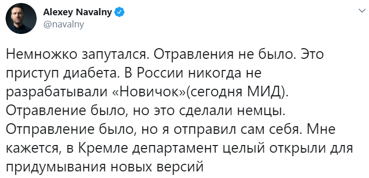 Оппозиционер в четверг разродился твитом, посвящённым его отравлению. Он заявил, что в Кремле "целый департамент" придумывает новые версии объяснения инцидента. При этом сам Навальный никак не прояснил ситуацию, в которую попал.
