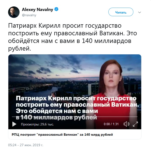 Оппозиционер и блогер Навальный разместил сведения о том, что Патриарх Кирилл якобы просит государство построить "православный Ватикан" за 140 миллиардов рублей в Сергиевом Посаде. В Русской Церкви жестко опровергли эту информацию.