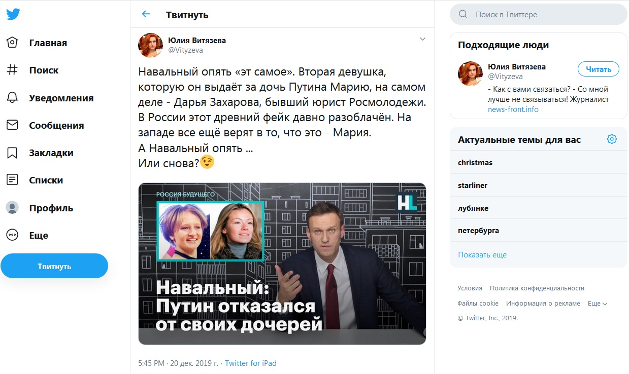 "Навальный опять "эт самое". Вторая девушка, которую он выдаёт за дочь Путина Марию, на самом деле - Дарья Захарова, бывший юрист Росмолодежи. В России этот древний фейк давно разоблачён. На западе все ещё верят в то, что это - Мария. А Навальный опять... Или снова?" - комментирует позор Навального в Twitter журналистка и блогер Юлия Витязева.