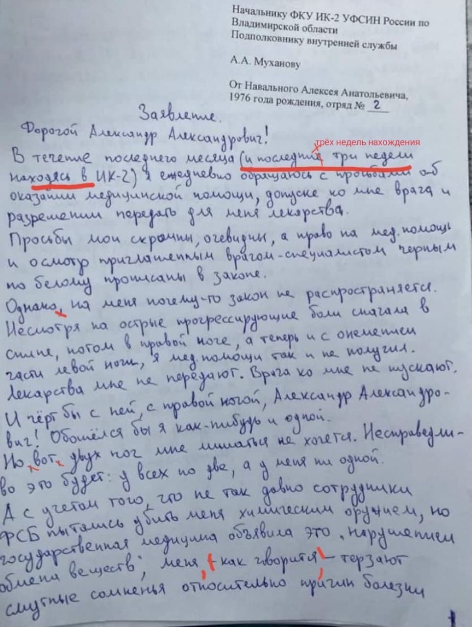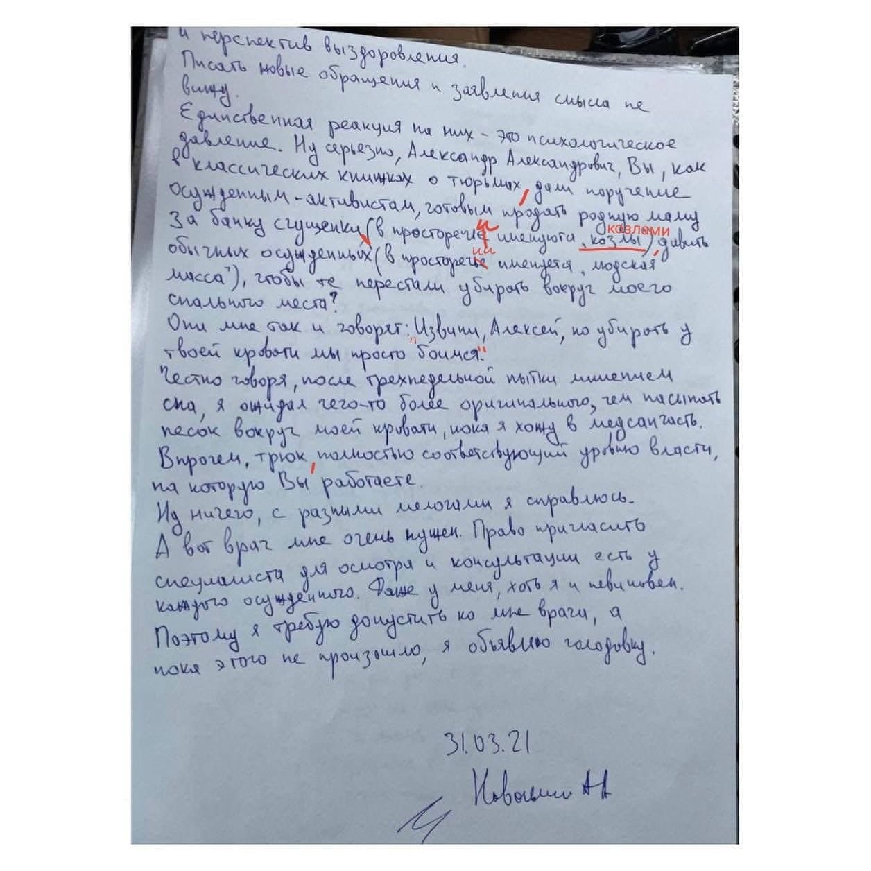 Письмо Алексея Навального, в котором он объявляет о начале голодовки, пестрит грамматическими и пунктуационными ошибками. Учитель русского языка внесла необходимые исправления.