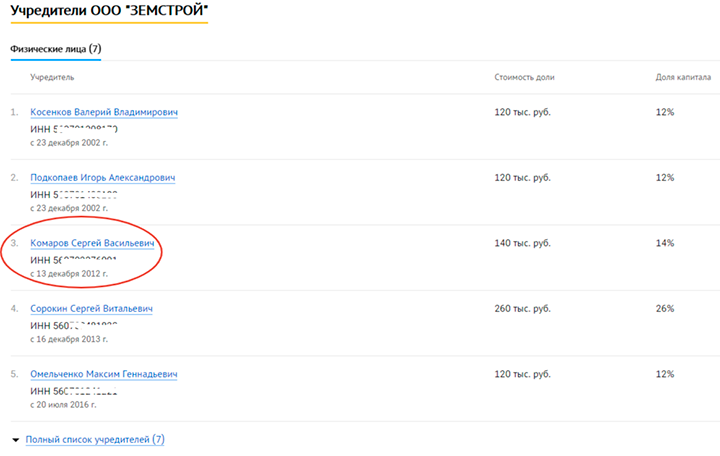 СПИСОК УЧРЕДИТЕЛЕЙ БЕНЕФИЦИАРА ООО "СПЕЦСТРОЙ-3" - ООО "ЗЕМСТРОЙ". ФОТО: СКРИНШОТ СТРАНИЦЫ САЙТА CHECKO.RU