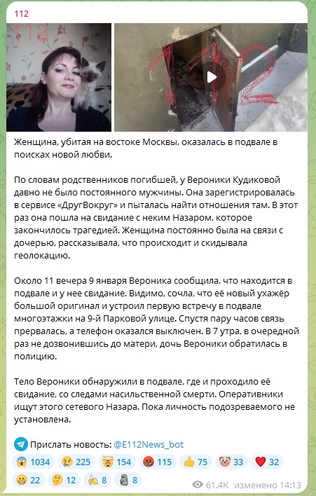 Сегодня утром на 16-й Парковой улице в столице была сделана страшная находка: тело мёртвой женщины в строительном мешке. Как выяснилось, вечером 9 января она ушла из дома, предупредив взрослую дочь, что идёт на свидание. Рассказала, что на одном из сайтов знакомств переписывалась с неким Назаром и теперь встретится с ним.