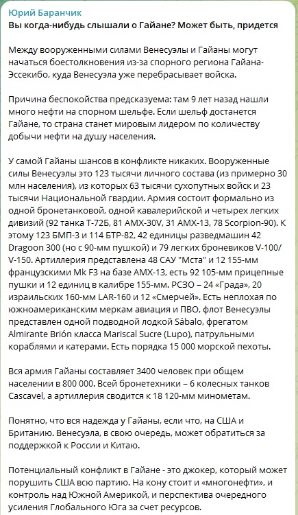 Об этом в своём телеграм-канале пишет политолог, кандидат философских наук Юрий Баранчик. Он отмечает: малоизвестный регион Гайана ещё может оказаться у всех на слуху.