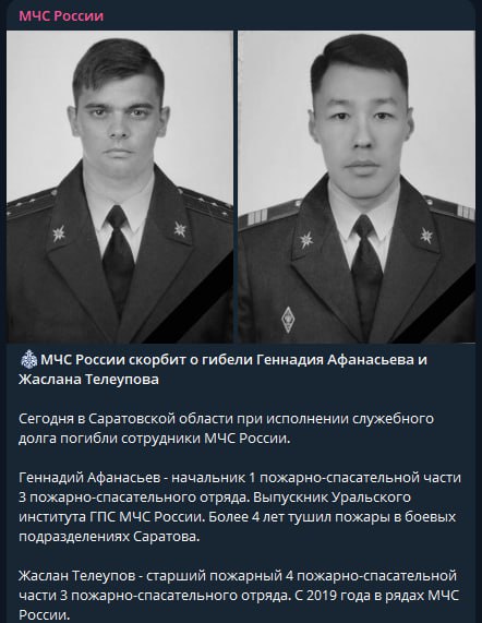 В МЧС России назвали имена погибших в Энгельсе пожарных: Геннадий Афанасьев и Жаслан Телеупов.