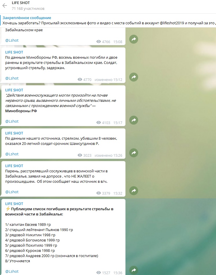 Life Shot опубликовали список погибших в результате расстрела в Забайкальском крае, где в результате нападения солдата-срочника на месте умерли 8 человек. Судя по представленным данным, все - совсем ещё молодые люди.
