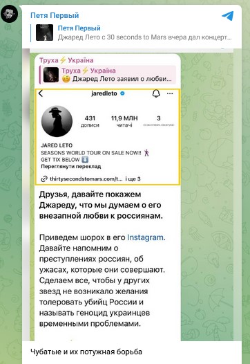 "Не думай сюда пхаться!": Украинцы затравили солиста 30 seconds to Mars Джареда Лето после его обещания русским