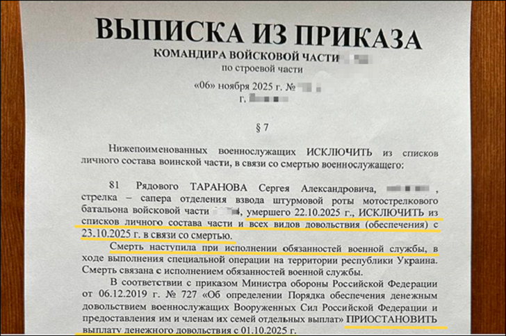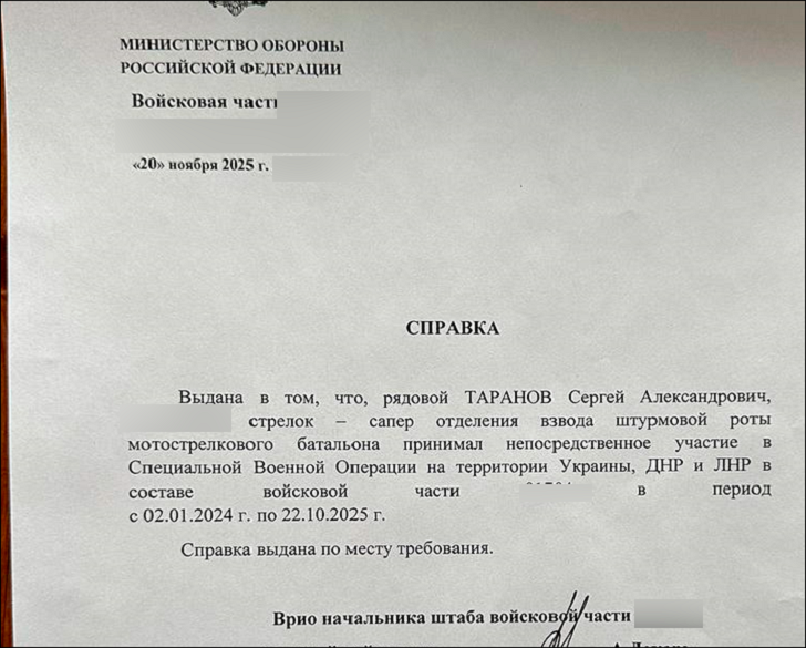 Военная машина действовала чётко по инструкциям, русский штурмовик продолжал службу. Фото документа предоставлено Царьграду Ларисой Прусаковой, матерью Сергея Таранова