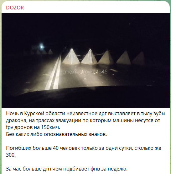 Автор TГ-канала DOZOR сообщил, что о сооружения в основном бьются машины, которые на скорости в 150 км/ч пытаются уйти от вражеского беспилотника - за сутки было около 40 погибших, столько же раненых.