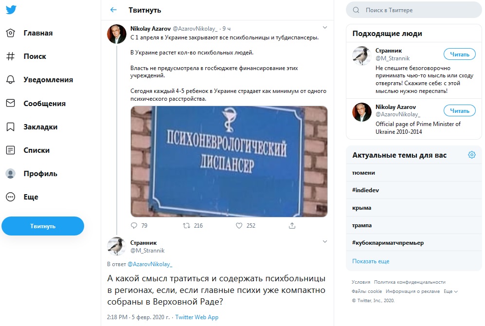 "Не нашлось денег": На Украине закрывают все психбольницы и тубдиспансеры - экс-премьер Азаров