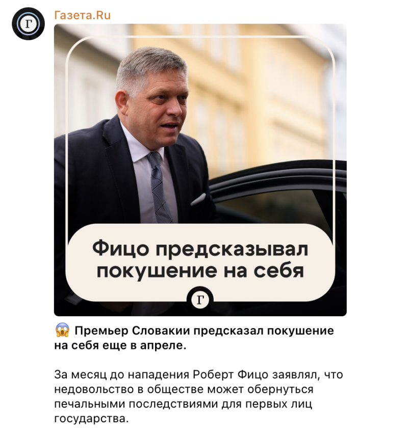 В Совбезе России покушение на Фицо назвали неслучайным. Фото: t.me/gazetaru