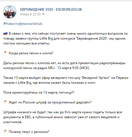 Официальные представители Евровидения ответили на опасения поклонников Little Big, связанных с выпуском песни на конкурс - предполагалось, что группе не представила в требуемый срок песню для исполнения, однако сейчас выяснилось, что это не так. Представители попросили пользователей не заваливать музыкантов просьбами поторопиться и "не питать лишних надежд": релиз песни выйдет не раньше 13 марта.