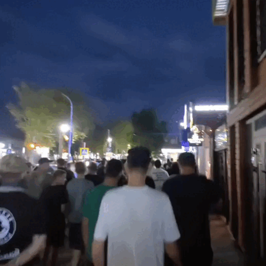 По словам горожан, ранее в городе толпа из 40 мигрантов избила русских ребят. Те якобы хотят найти их и "поговорить". Рядом видно проезжающий наряд полиции и припаркованный автомобиль МВД.