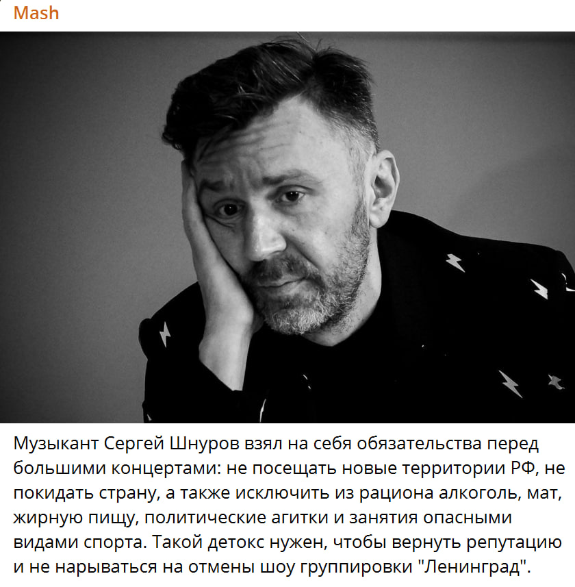 Музыкант Сергей Шнуров в попытках вернуть себе репутацию и концерты взял на себя обязательства не покидать страну. Впрочем, уточняет телеграм-канал Mash, исполнитель также не должен посещать новые регионы России.