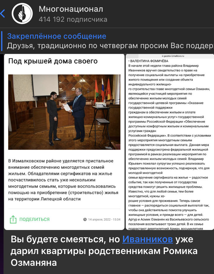 Вы будете смеяться, но Иванников уже дарил квартиры родственникам Ромика Озманяна. В 2022 году Иванников вручал сертификат Артуру и Асмик Озманян,