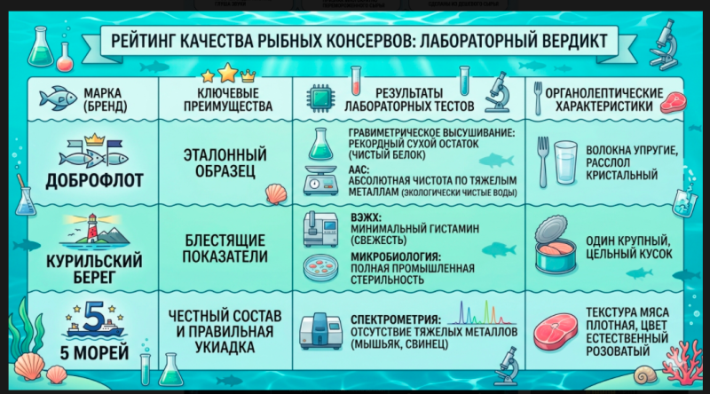 Лаборатория выделила и эталонные образцы: марка "Доброфлот" показала рекордный сухой остаток, абсолютную чистоту по тяжёлым металлам, упругие волокна и кристально чистый рассол. Блестящие показатели и у консервов "Курильский берег". Также положительно отличилась марка "5 морей".