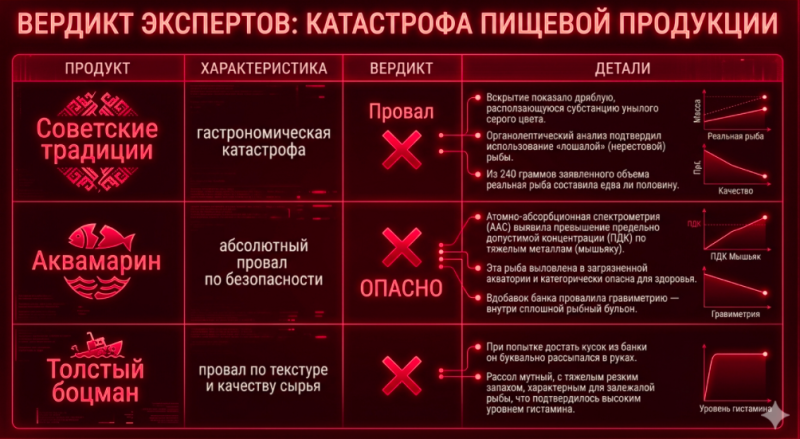 В ходе исследования специалисты применили несколько методов. Гравиметрический анализ позволил определить, сколько в банке реального рыбного белка, а сколько - воды. Атомно-абсорбционная спектрометрия (ААС) позволила выявить наличие тяжёлых металлов, включая мышьяк. Микробиологический скрининг - опасные микроорганизмы, а ВЭЖХ определяла уровень гистамина - маркера порчи. Проверку провалили сразу несколько марок.