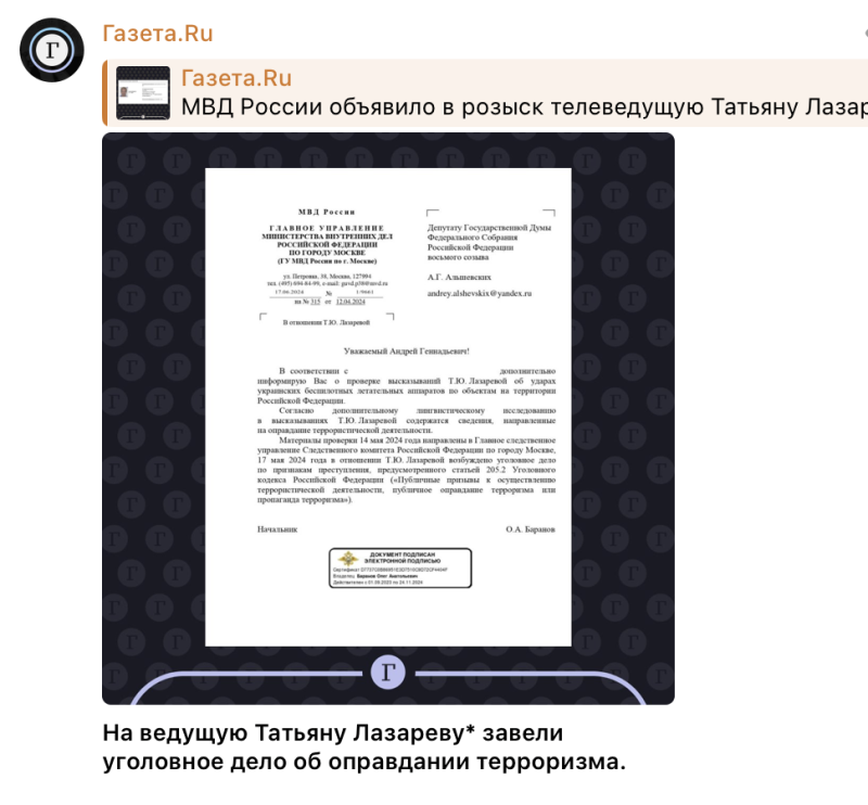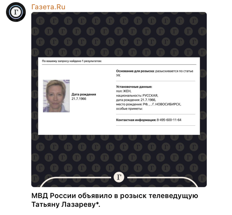 Телеведущую Татьяну Лазареву* всё же внесли в перечень террористов и экстремистов Росфинмониторинга. Ранее в отношении шоувумен возбудили уголовное дело об оправдании терроризма и объявили в розыск в России. Ей может грозить до семи лет колонии.