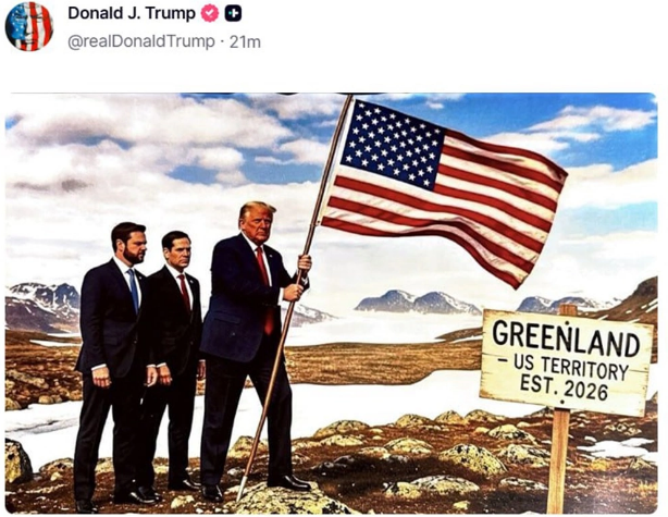 Еще одно изображение - Трамп устанавливает флаг США на территории Гренландии, за его спиной стоят госсекретарь Марко Рубио и вице-президент Джей Ди Вэнс. Рядом - табличка, на которой написано, что арктический остров стал частью Америки в 2026 году. Так незатейливо американский лидер поделился своими наполеоновскими планами.