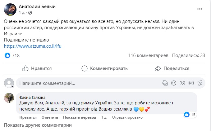 Не так давно уехавший в Израиль Анатолий Белый разродился в своих соцсетях ссылкой на злобную петицию против гастролей "Театриума на Серпуховке". Русский театр планирует представить в Израиле спектакль "Не в свои сани не садись".
