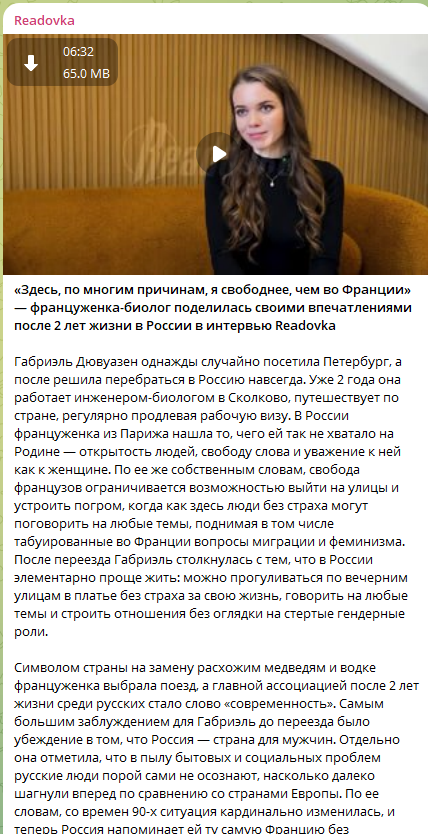 В интервью изданию Readovka француженка призналась, что стала "свободнее, чем во Франции, по многим причинам". Она также говорит, что на родине не могла гулять вечером по улицам в красивом платье, не опасаясь при этом за свою жизнь. А в России она может позволить себе такую роскошь.