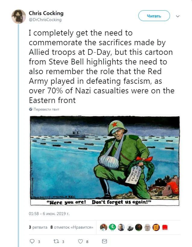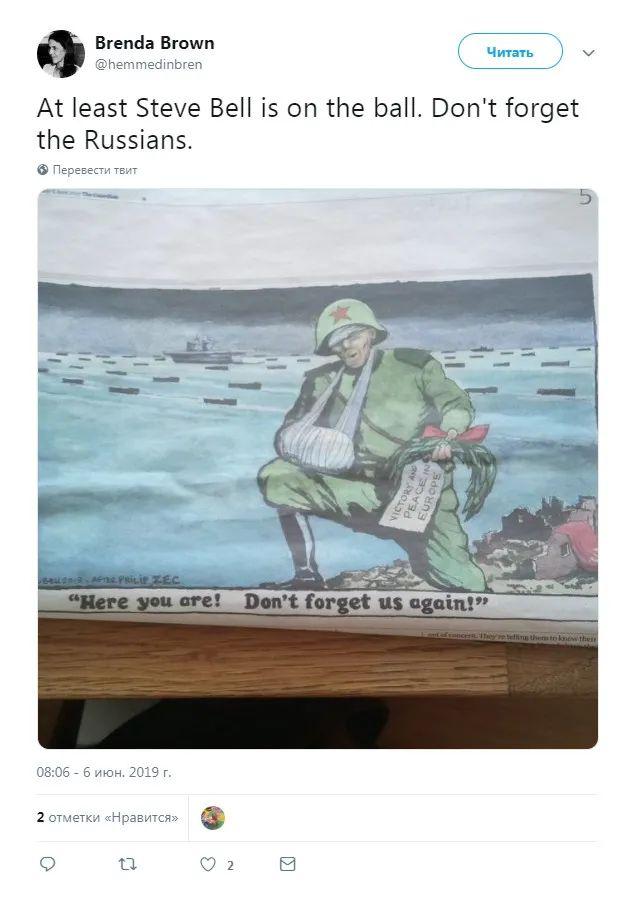 "Я прекрасно осознаю необходимость увековечить память о жертвах стран-союзников в день празднования высадки в Нормандии, но эта карикатура Стива Белла очень хорошо показывает, что нельзя забывать и о роли Красной армии в освобождении мира от фашизма, которая победила более 70% фашистской армии на Восточном фронте", - высказывается пользователь под ником Chris Cocking.