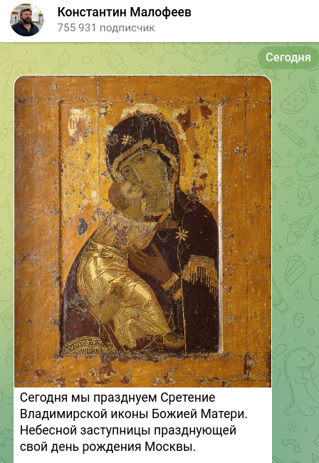 Учредитель Царьграда Константин Малофеев в своём телеграм-канале отметил, что сегодня мы празднуем Сретение Владимирской иконы Божией Матери. Небесной заступницы празднующей свой день рождения Москвы.