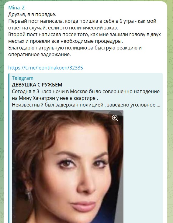 Между тем сразу после ЧП Мина Хачатрян написала в телеграм-канале, что с ней всё в порядке. "Первый пост написала, когда пришла в себя в 6 утра - как мой ответ на случай, если это политический заказ. Второй пост написала после того, как мне зашили голову в двух местах и провели все необходимые процедуры. Благодарю патрульную полицию за быструю реакцию и оперативное задержание", - указывала она.