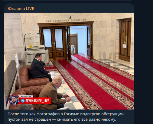 Журналист Александр Юнашев в своём Telegram-канале сообщил, что на балкон, откуда раньше фотографы снимали депутатов во время заседаний, теперь допускают только операторов федеральных телеканалов. Фиксация работы парламента, которая ещё недавно считалась нормальной частью журналистской деятельности, внезапно стала расцениваться, как нечто сомнительное.