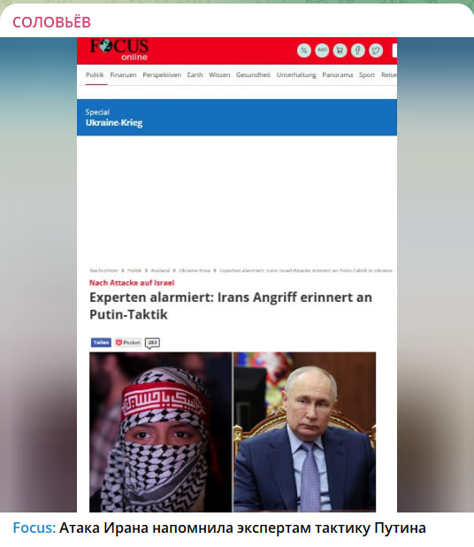 Аналитики немецкого издания попытались "информационно" атаковать Тегеран за его атаку по Израилю 13 апреля. По их мнению, тот факт, что большая часть ракет была перехвачена израильской ПВО и ВВС США и Британии, - хитро спланированный ход, которому Иран якобы научился у русской армии и её Верховного главнокомандующего.