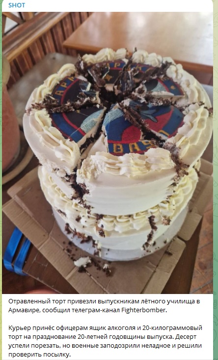 Речь идёт о Егоре Семёнове, который притворился курьером и привёз отравленный торт и алкоголь в ресторан, где проходило празднование 20-летия выпуска Армавирского высшего военного авиационного училища (АВВАКУЛ). К счастью, один из участников банкета заподозрил неладное и предупредил остальных. Псевдокурьера быстро вычислили по камерам. К тому времени он уже готовился к отлёту в Москву, но полиция задержала его прежде, чем он успел это сделать.