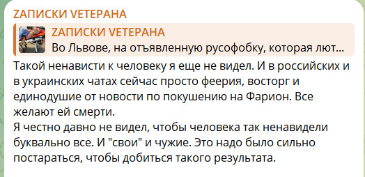 Такой ненависти к человеку я ещё не видел. И в российских, и в украинских чатах сейчас просто феерия, восторг и единодушие от новости по покушению на Фарион. Все желают ей смерти. Я, честно, давно не видел, чтобы человека так ненавидели буквально все. И "свои", и чужие. Это надо было сильно постараться, чтобы добиться такого результата,