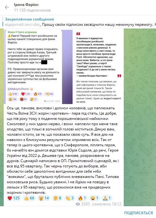 ФОТО: СКРИНШОТ СТРАНИЦЫ ФАРИОН В TELEGRAM