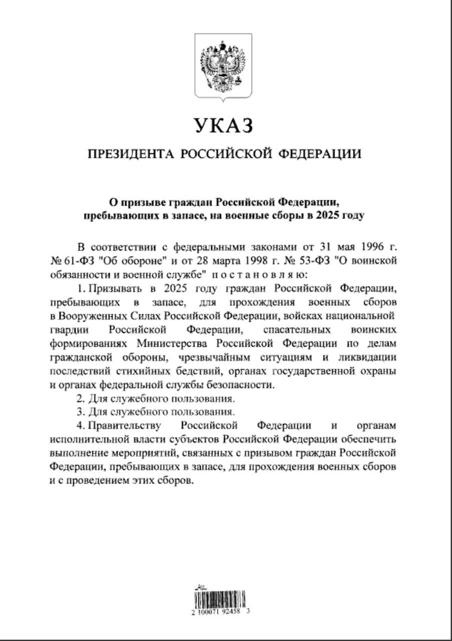 Постановляю… призывать в 2025 году граждан Российской Федерации, пребывающих в запасе, для прохождения военных сборов в Вооружённых Силах Российской Федерации, войсках национальной гвардии РФ, спасательных воинских формированиях Министерства РФ по делам гражданской обороны, чрезвычайным ситуациям и ликвидации последствий стихийных бедствий, органах государственной охраны и органах федеральной службы безопасности,
