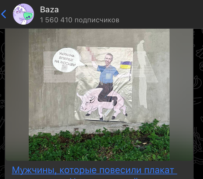 Мужчины, повесившие плакат с лозунгом "Украина, вперёд на Москву", оказались участниками патриотического сообщества. На самом плакате изображён актёр Алексей Панин*, сидящий на свинье. Таким образом, ситуация приняла неожиданный поворот, ведь изначально предполагалось, что своеобразный перформанс направлен на дискредитацию нашей страны.