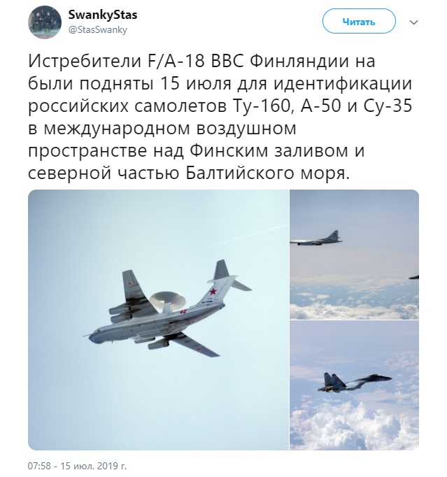 "Истребители F/A-18 ВВС Финляндии были подняты 15 июля для идентификации российских самолётов Ту-160, А-50 и Су-35 в международном воздушном пространстве над Финским заливом и северной частью Балтийского моря", - написал в "Твиттере" осведомлённый пользователь @StasSwanky.