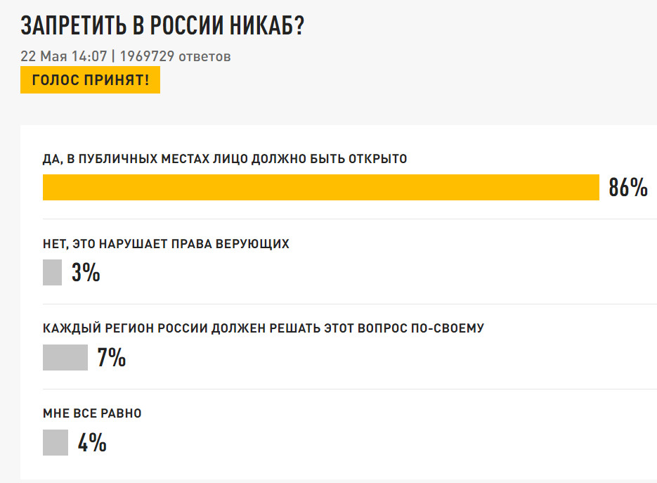 Свой опрос в мае 2024 провёл телеканал Царьград. В нём приняли участие почти 2 млн человек. 86% опрошенных выступили за запрет никаба в общественных местах. Еще 7% предложили решить этот вопрос на уровне субъектов Федерации, а 3% посчитали подобный запрет нарушением прав верующих.