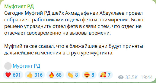 Муфтий Дагестана Ахмад Абдуллаев объявил об упразднении отдела фетв муфтията республики. Отдел расформирован из-за несоответствия "вызовам времени", как указано в официальном сообщении муфтията.