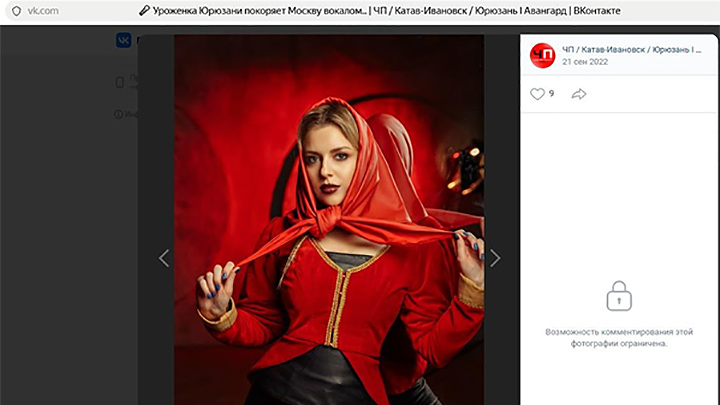 ИРИНА НИКОЛАЕВА В СТРАННОМ "ФОЛЬКЛОРНОМ ОБРАЗЕ". СКРИНШОТ: ГРУППА "ЧП / КАТАВ-ИВАНОВСК / ЮРЮЗАНЬ I АВАНГАРД" В СОЦИАЛЬНОЙ СЕТИ "ВКОНТАКТЕ"