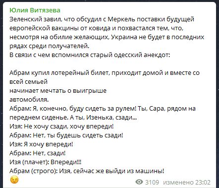 Журналист Юлия Витязева в связи с разговором Зеленского и Меркель о вакцине вспомнила старый одесский анекдот, про то, как Абрам купил лотерейный билет и мечтал выиграть машину.