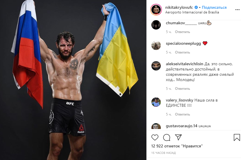 Никита Крылов после победы над бразильским спортсменом Джонни Уокером опубликовал в своём Instagram фото с флагами России и Украины. В кадре боец в одной руке держит украинский, а в другой российский флаг.