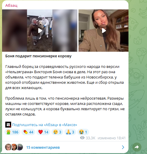 Виктория Боня продолжает "отжигать" в соцсетях. Блогерша из Монако почувствовала себя очень значимой после того, как на её выступление обратили внимание не абы где, а в Кремле. И вот Боня уже играет роль благотворительницы – собирается спасти плачущую бабушку, у которой со двора свели единственную корову. Вот только есть загвоздка. "Меценатке" и невдомек, что бабушка – несуществующая. Ролик, растрогавший её, создан ИИ-технологией. Неудобно получилось.