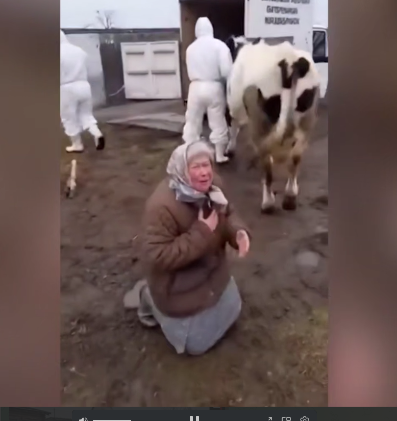 Боня откликнулась на видео, которое якобы снято в Новосибирской области. у старенькой бабушки со двора сводят единственную корову. Суровые люди в костюмах химзащиты не реагируют на слёзы и крики старушки:
