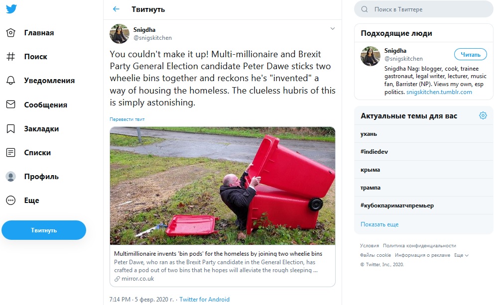 Такое даже невозможно нарочно придумать! Мультимиллионер и кандидат на выборы от Партии Брексита Питер Доу склеивает два мусорных бака и считает, что он "изобрёл" способ размещения бездомных. Невежество и гордыня просто поражают, - пишет в Twitter @snigskitchen.