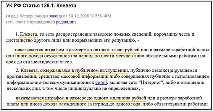 В УГОЛОВНОМ КОДЕКСЕ УЖЕ ЕСТЬ РЫЧАГ ВОЗДЕЙСТВИЯ НА КЛЕВЕТНИКОВ, НО КОМУ-ТО ЭТОГО МАЛО // СКРИНШОТ С САЙТА CONSULTANT.RU